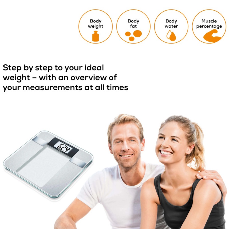 Product Information:Weighing made easy! The scale with large LCD display shows you your weight, body fat, body water and muscle percentage and even calculates your BMI!
