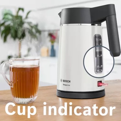 Prepare tea for all your guests at once using the Bosch DesignLine Ergo TWK5P471GB Cordless Jug Kettle. Its generous 1.7 litre capacity is perfect when you're making hot drinks for a crowd. It also has a large cup indicator, so you'll know exactly know much water you need for the number of cups of coffee you're making. Simply pop the spout under your kitchen tap for easy refilling. You can also open the lid at the touch of a button.