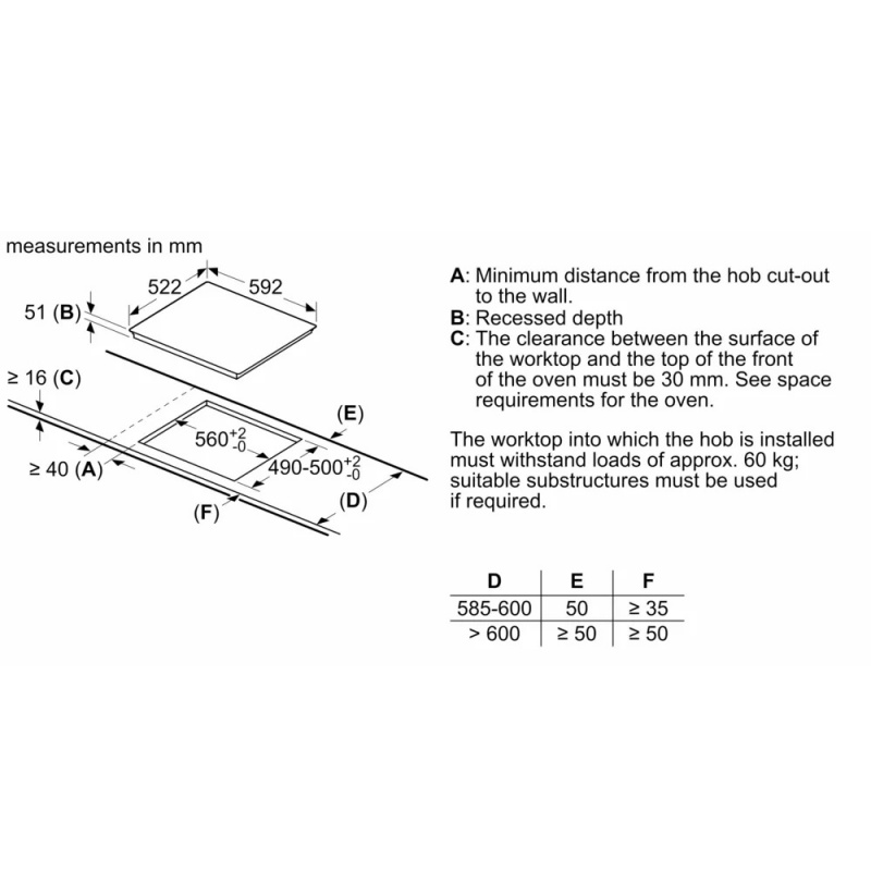 • Required niche size for installation (HxWxD): 51 x 560-560 x 490-500 mm
