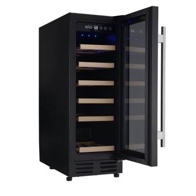 Up to 18 bottles can fit inside the cooler on six wooden shelves, with button controls at the top of the interior that has an adjustable temperature range of five to 22 degrees.