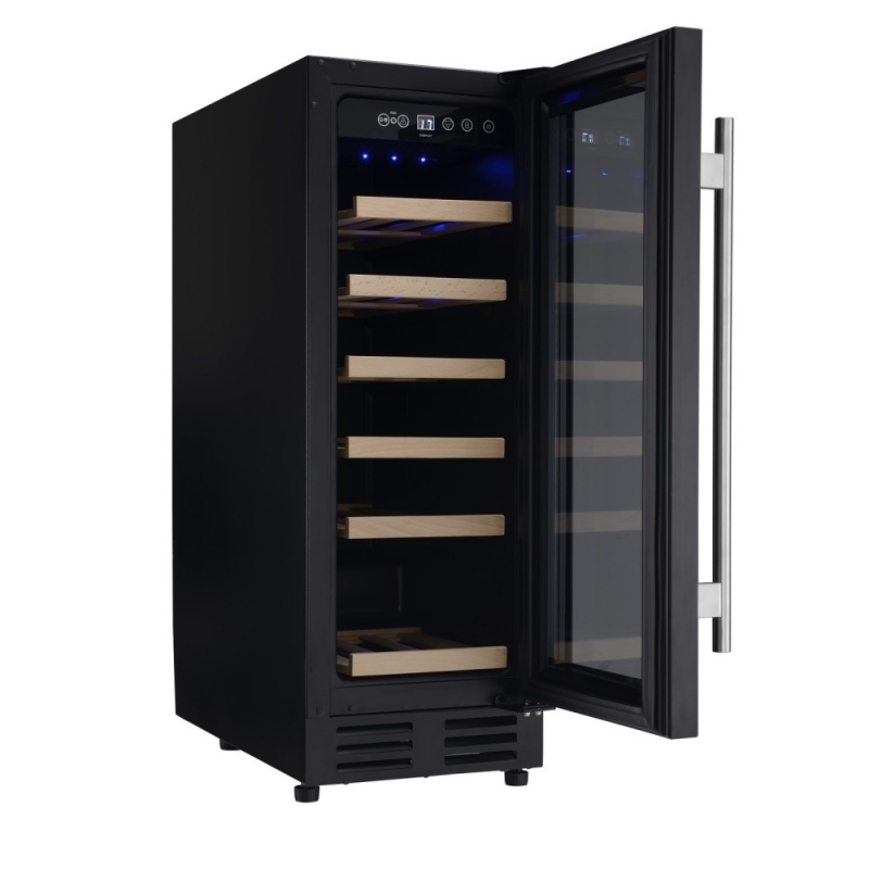 The glass door, which has a stainless steel trim and handle, protects the wine by deflecting away the detrimental effects from outside heat and light.
