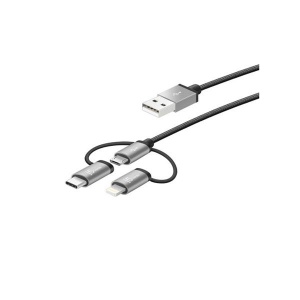 Charge your phone, tablet and laptop* from the same USB cable. This 2m three-in-one braided cable features two interchangeable USB-C and Lightning tips that easily connects on top of the Micro B of the cable.