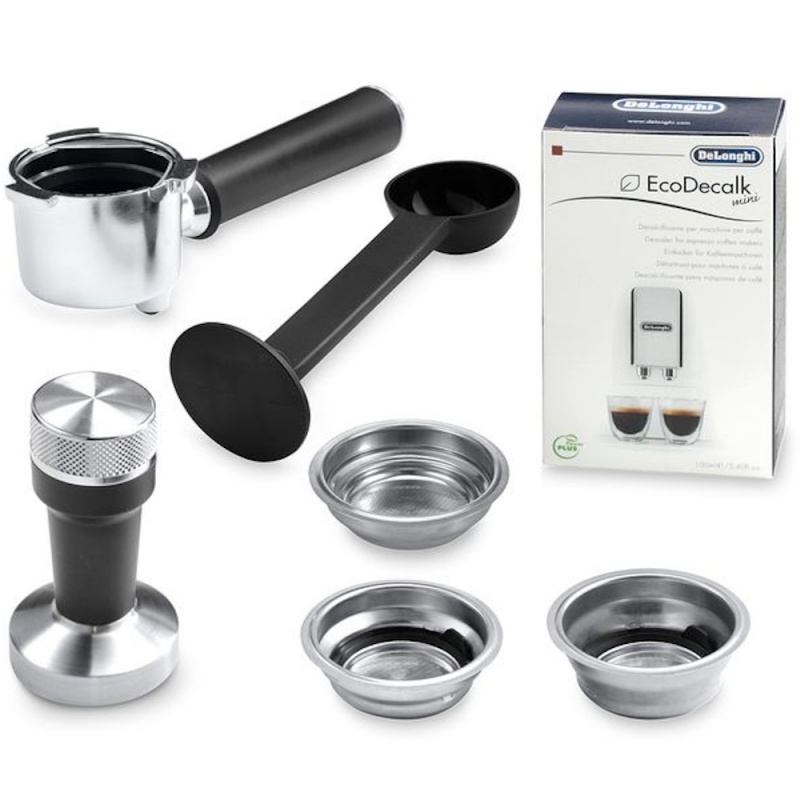 • Box Contents: Coffee Machine, Filter Holder, 3 x filter baskets, tamper, milk jug, descaler