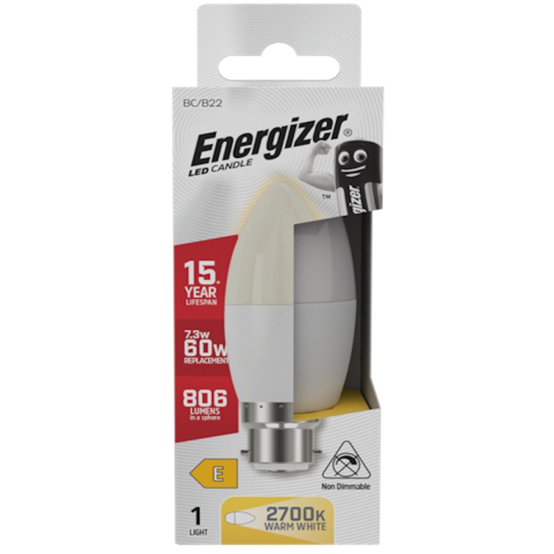 Product Information:Upgrade your lighting with the Energizer LED 7.3W Candle Lamp. This energy-efficient bulb is designed to replace traditional 60W incandescent bulbs without sacrificing brightness. With 806 lumens and a warm white color temperature of 2700K, this B22 opal candle lamp provides a cozy atmosphere in any room.