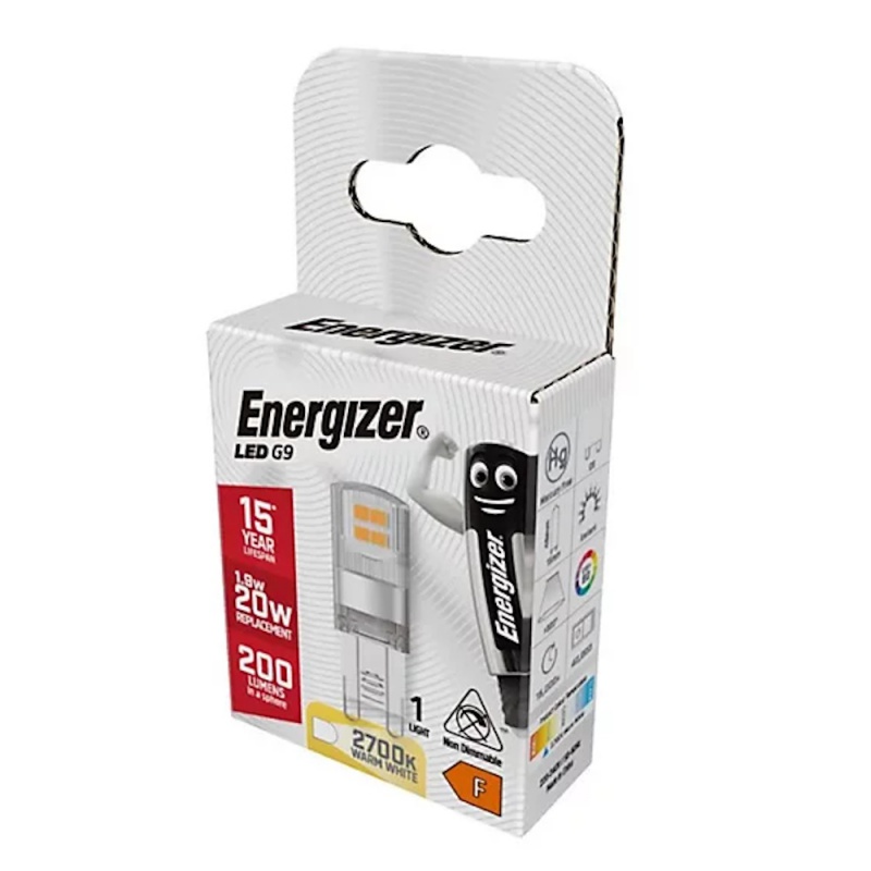 Product Information:The Energizer G9 LED Filament Bulb is an energy-efficient lighting solution designed to combine style with performance. Consuming just 1.8W while delivering the brightness of a traditional 20W bulb, it produces a warm, inviting glow ideal for kitchen lighting, decorative fixtures, and display applications. With instant start technology, the bulb lights up immediately with no warm-up time. Built to last, it offers an approximate lifespan of 15,000 hours (up to 15 years), significantly reducing replacement frequency. It also uses up to 90% less energy, making it an eco-friendly and cost-effective choice for everyday lighting needs.