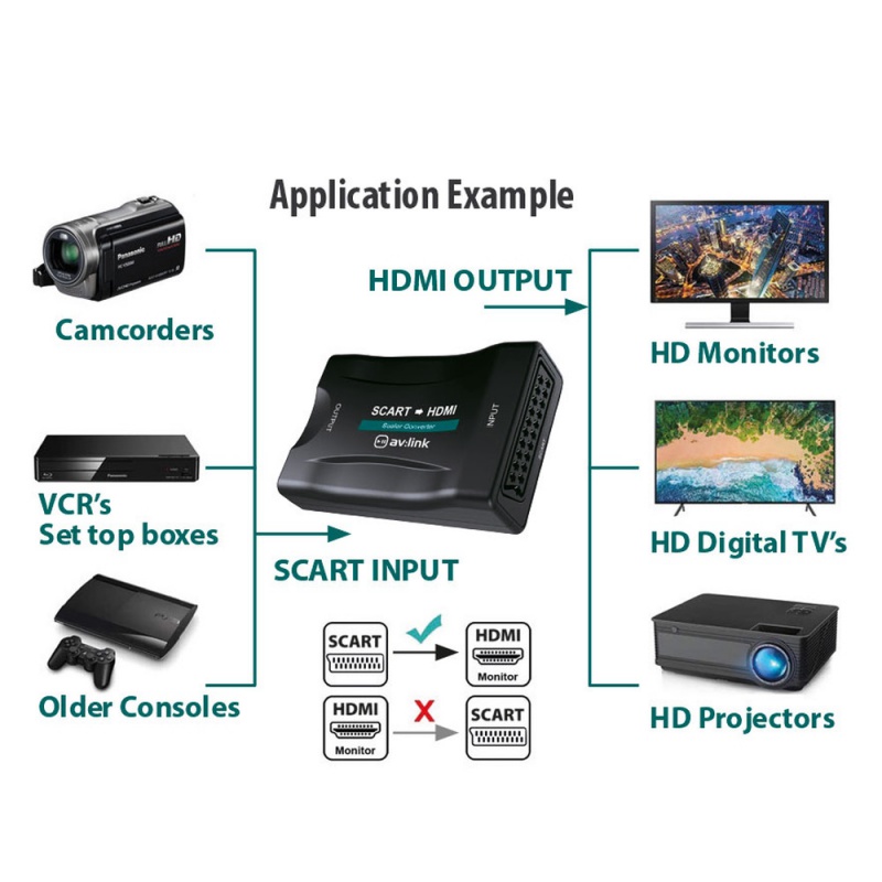 A simple USB powered unit that converts analogue video signals from older devices with a Scart interface to high-definition HDMI outputs. Simple to install and operate, this handy little device is ideal for use with VCR's, DVD players, Games consoles, Freeview boxes etc when connecting to newer HDTV's or displays.