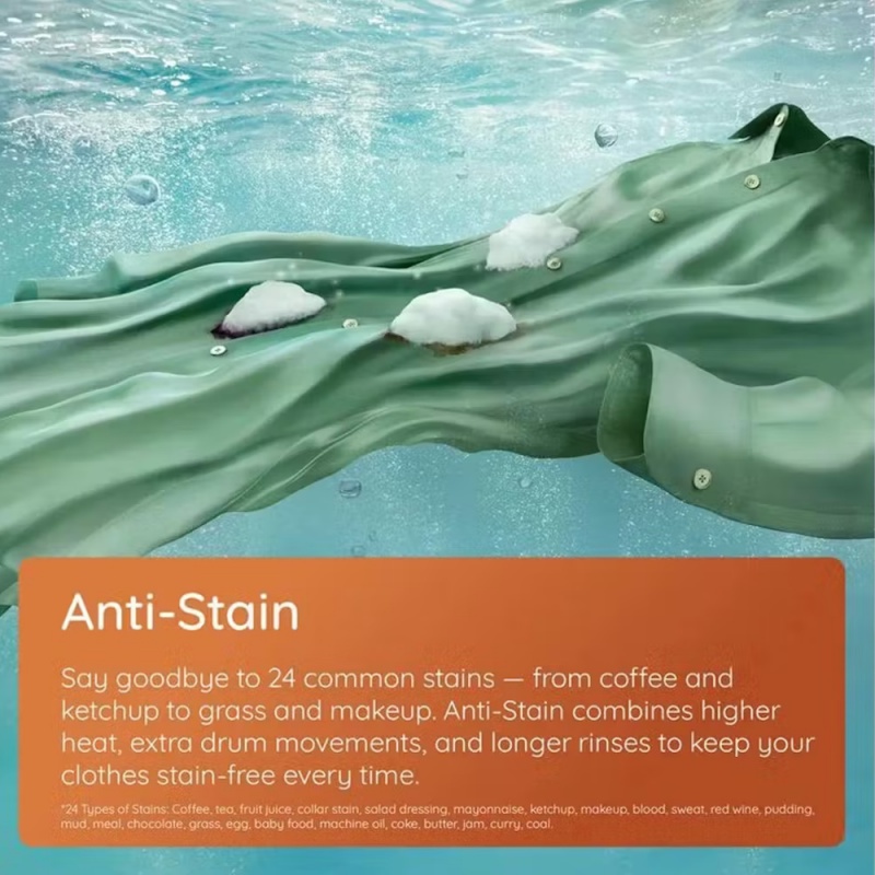 - Delay Start, Steam, Reduces Creases, Variable Spin, Extra Rinse, Anti-Stain Technology, Pre-Wash, Indicators, Digital countdown indicator, Inverter Motor, Spin+Drain, Foam control, Rinse, Synthetics