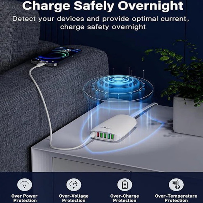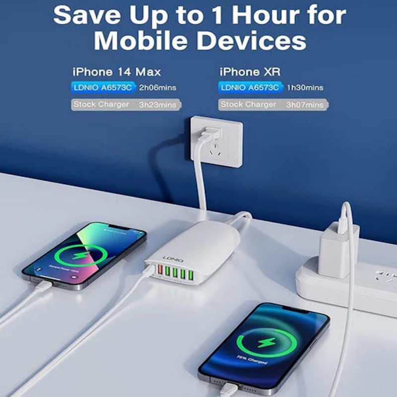 The LDNIO 6-port fast charging station provides fast charging to virtually all USB-A and USB-C phones, tablets, laptops, and with 3 AC outlets, you can also connect your home appliances like TV, lamp and etc.