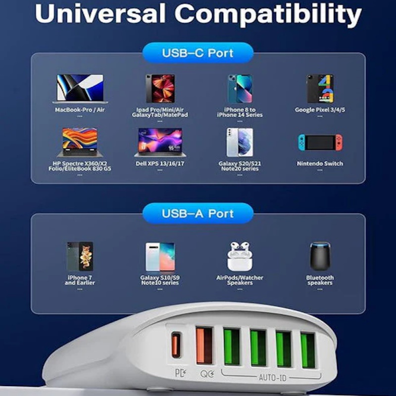 The LDNIO fast-charging 65W usb c charging station can power your MacBook, iPhone, other home appliances, and up to 6 devices at the same time with 1USB-C ports and 5 USB-A ports.