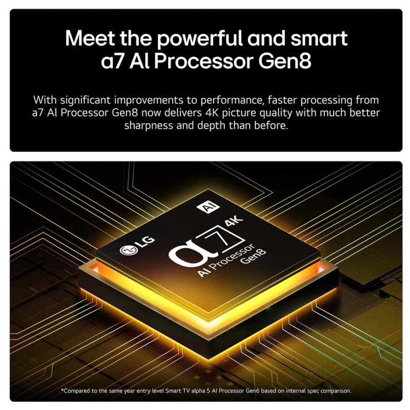 The grass really is greener with the LG QNED82 43" TV. Colours really pop thanks to Dynamic QNED technology with 100% colour volume. It's not just vibrant, it's true-to-life with a full spectrum of hues that LCD TVs didn't quite nail before. The a7 AI Processor is the brain of the TV. It's hard at work in the background, intelligently boosting the picture and sound of everything you watch. Plus, you'll always get the best picture with AI Brightness Control – it uses the TV's ambient sensor to adapt to the light in the room.