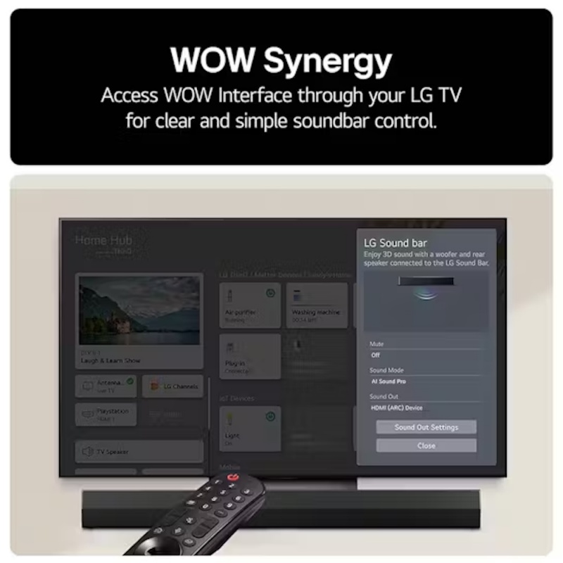 Unparalleled synergy when paired with LG TV. Control the soundbar’s modes, volume, connection and other settings through the convenient UI, LG WOW Interface. Simply check and adjust your soundbar on TV screen.