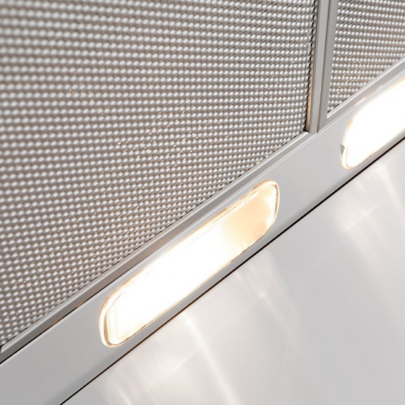 We use 18/10 grade stainless steel on our complete range of hoods and all joints are fully welded and polished to give a quality finish. This extractor features 2x LED lights and 550m³/hr motor.