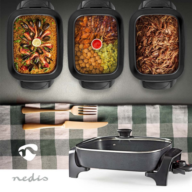 Frying, baking, stewing, braising, cooking: this multipurpose Nedis electric frying pan provides you with all the flexibility to cook what you want, where you want - you only need a power socket. Think how convenient this is while you’re out camping, if you don’t have a gas connection or simply because you’d like to upgrade your standard kitchen cookware.