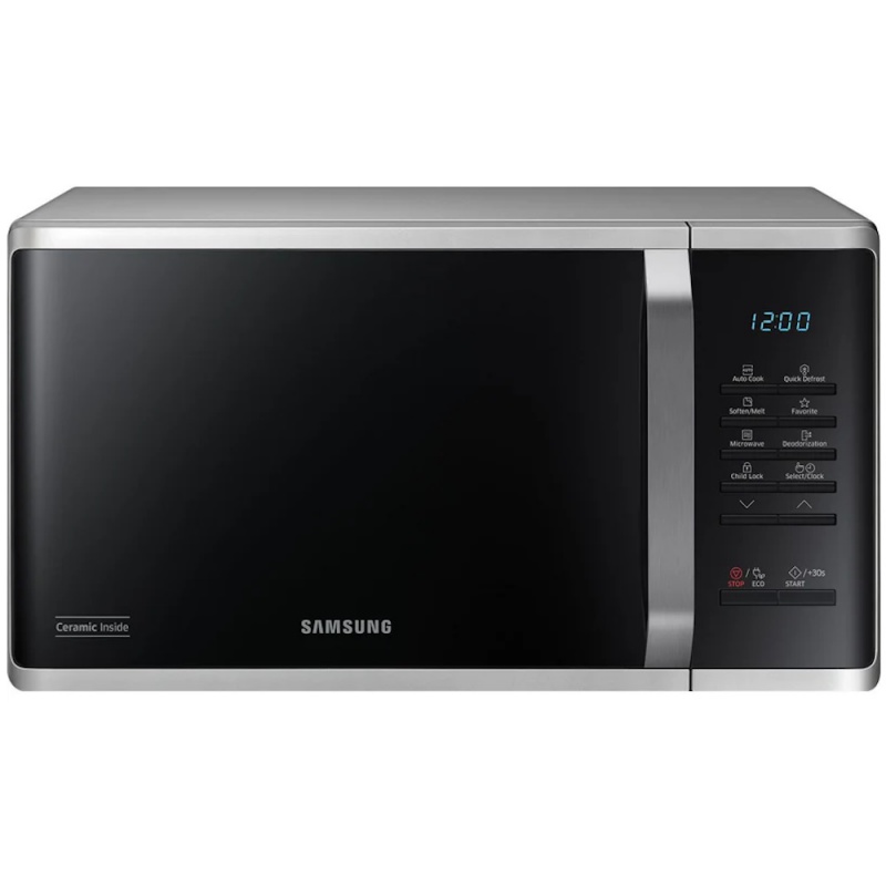 Product Information:The stylish, silver Samsung MS23K3523AS/EU microwave oven combines modern design with practical features. Its large 23-liter capacity accommodates even larger dishes, and the TDS (Triple Distribution System) technology ensures even and efficient heating. Easy-to-use automatic defrost programs make thawing frozen food quick and effective. The ceramic enamel interior is antibacterial, durable, and easy to clean. A clear digital display shows the current time and remaining heating time. The microwave includes a rotating glass plate, and you can mute the sound signals by pressing the "down arrow" and STOP buttons simultaneously.