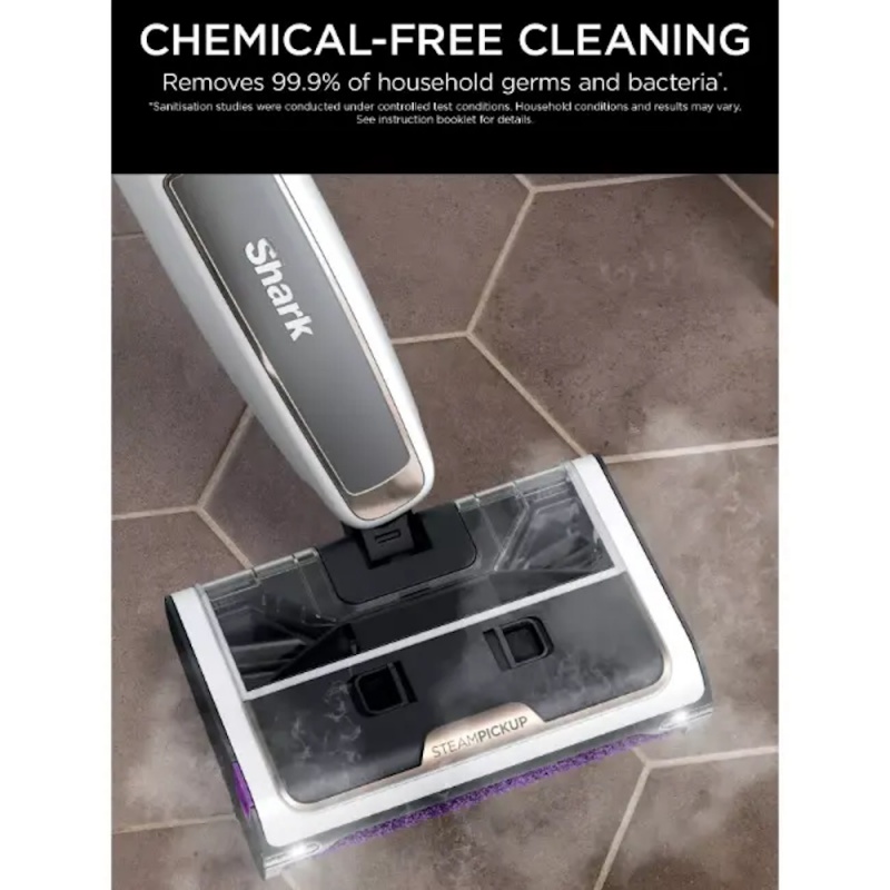 Product Information:The 3-in-1 debris-capturing steam mop: pick up debris, gently scrub, and sanitise all at once. Mopping just got a makeover with Shark SteamPickUp. Spilled breakfast cereal, dropped something dry, or discovered some muddy paw prints? You can tackle them all with Shark Powered Pickup Technology, perfect for homes with children and pets. Featuring chemical-free cleaning, Shark SteamPickUp removes 99.9% of household germs and bacteria* using steam alone.