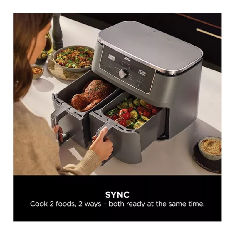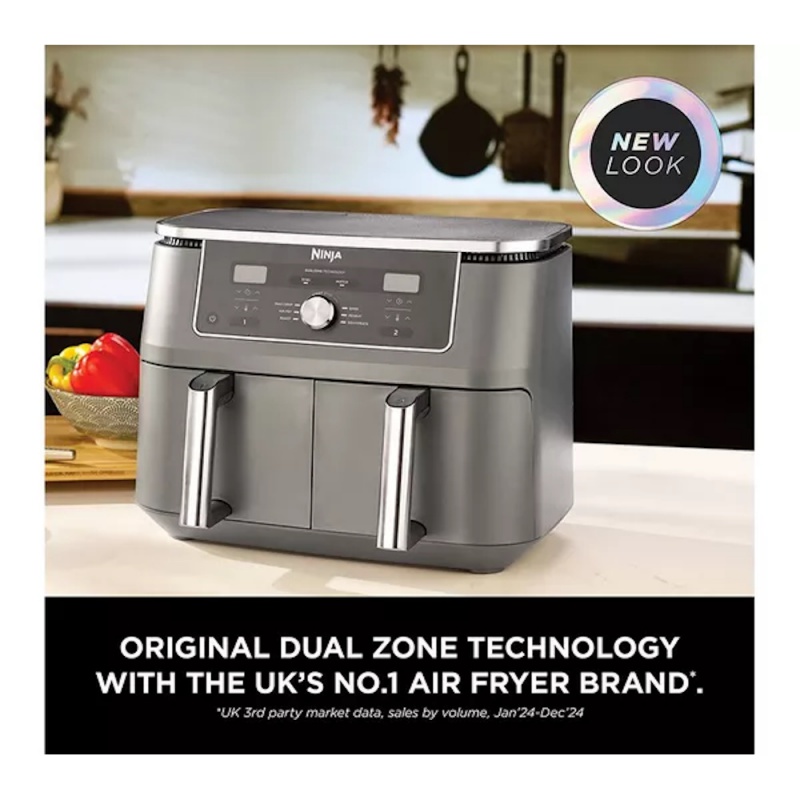 Product Information:Dual Zone cooking just got a brand new look. Meet the large capacity air fryer that cooks 2 foods, 2 ways, and finishes at the same time – now with an updated design and sleek, dark grey metallic trim.