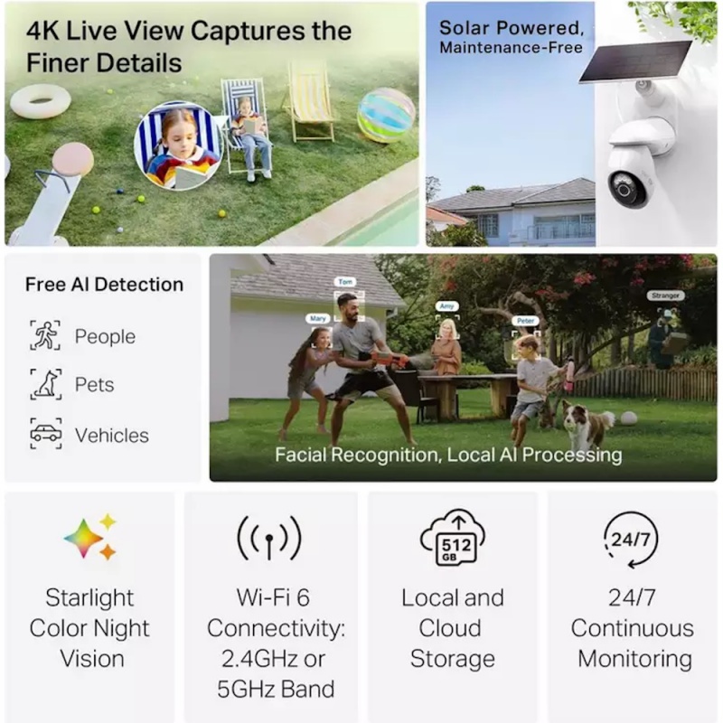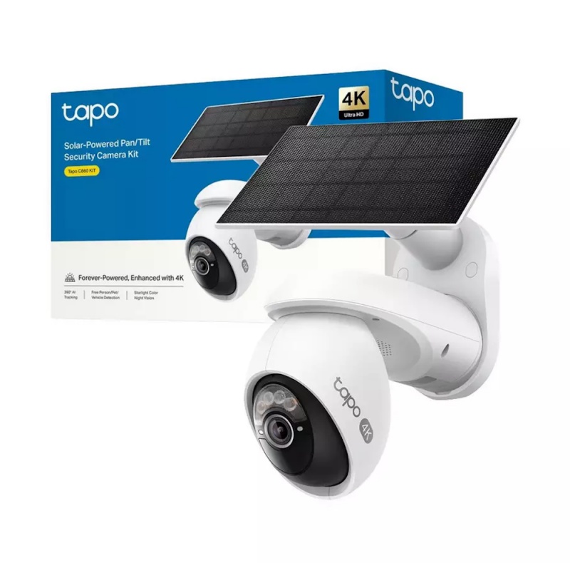 Product Information:The Tapo C660 Kit is a solar-powered pan/tilt 4K security camera bundle offering ultra-high clarity (8MP), 360-degree AI tracking, and detection of people, pets, and vehicles to reduce false alerts. It supports both 2.4GHz and 5GHz Wi-Fi, has starlight colour night vision with spotlights, and runs off solar power plus a 10,000mAh battery for maintenance-free outdoor use. Local storage supports up to 512 GB; compliant with IP65 weatherproofing.