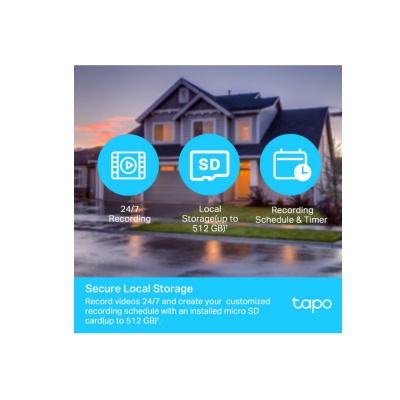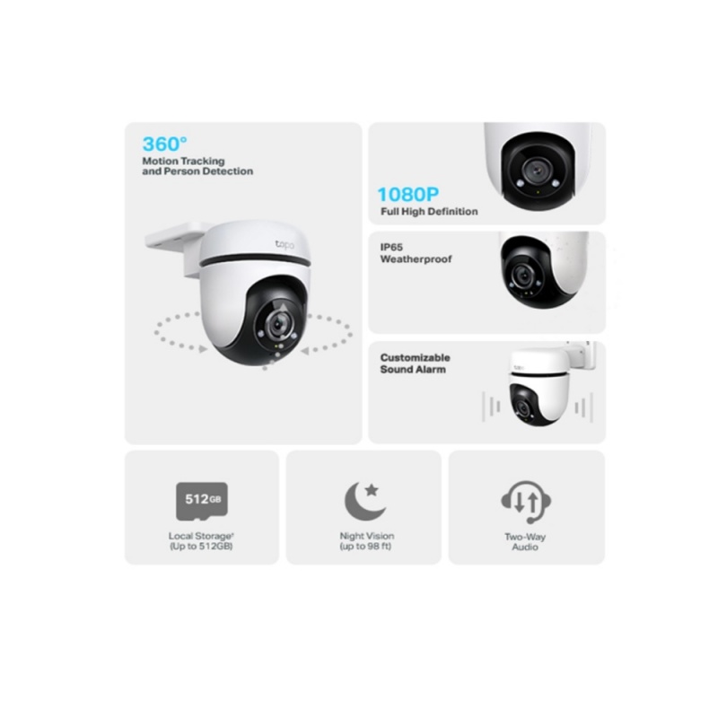 1080p Full HD Live View-Reveals clear and sharp images with more details. Person Detection and Motion Tracking-Smart AI identifies a person while tracking motion with high-speed rotation, notifying users as needed. 360° Visual Coverage-Provides 360° horizontal & 130° vertical range to cover every corner. Night Vision (up to 98 ft)-Ensures your safety by providing a clear visual distance of up to 98 ft even in total darkness. IP65 Weatherproof-Offers excellent waterproof and dustproof performance for outdoor scenarios. Multiple Installation Options-Use the mounting screws, template and loops‡ to install on any wall, ceiling or pole for the perfect view—wherever you want. Flexible Storage Choices-Save recorded videos to an installed microSD card(up to 512 GB)†, or use Tapo Care** cloud storage service. Customizable Sound Alarm-Record your customized audio as an alarm to extend your usages. Physical Privacy Mode-Maintains your privacy with the lens physically blocked by the housing. Two-Way Audio-Enables communication through a built-in microphone and speaker.