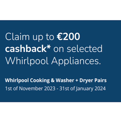 Claim up to €200* cashback when you purchase selected Whirlpool pairs of laundry appliances and selected Whirlpool cooking appliances from participating retailers** between the 1st of November 2023 to 31st of January 2024. Claim submissions can be made until the 29th of February 2024
